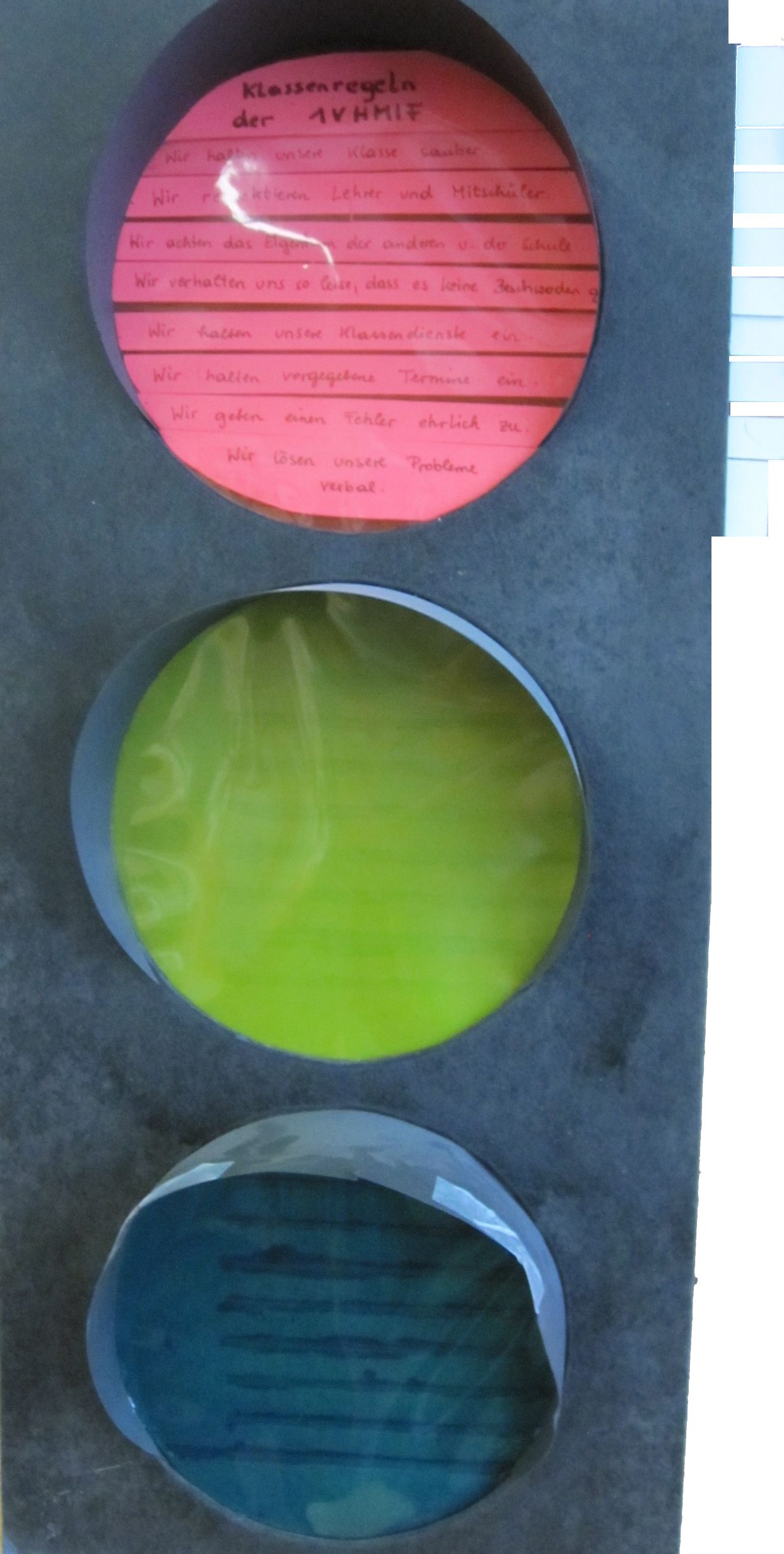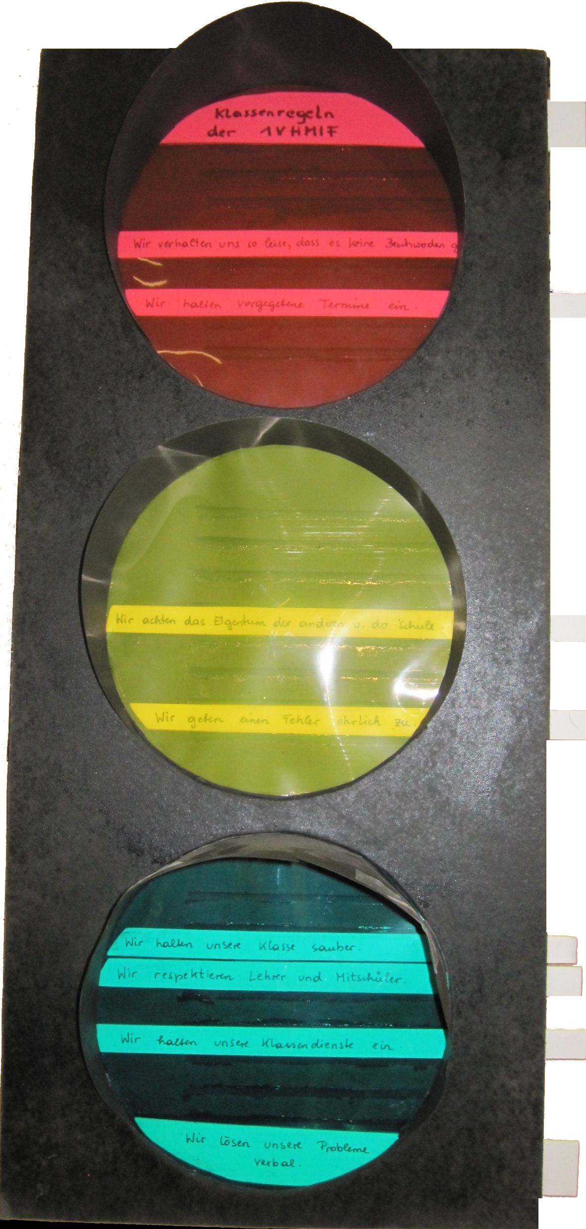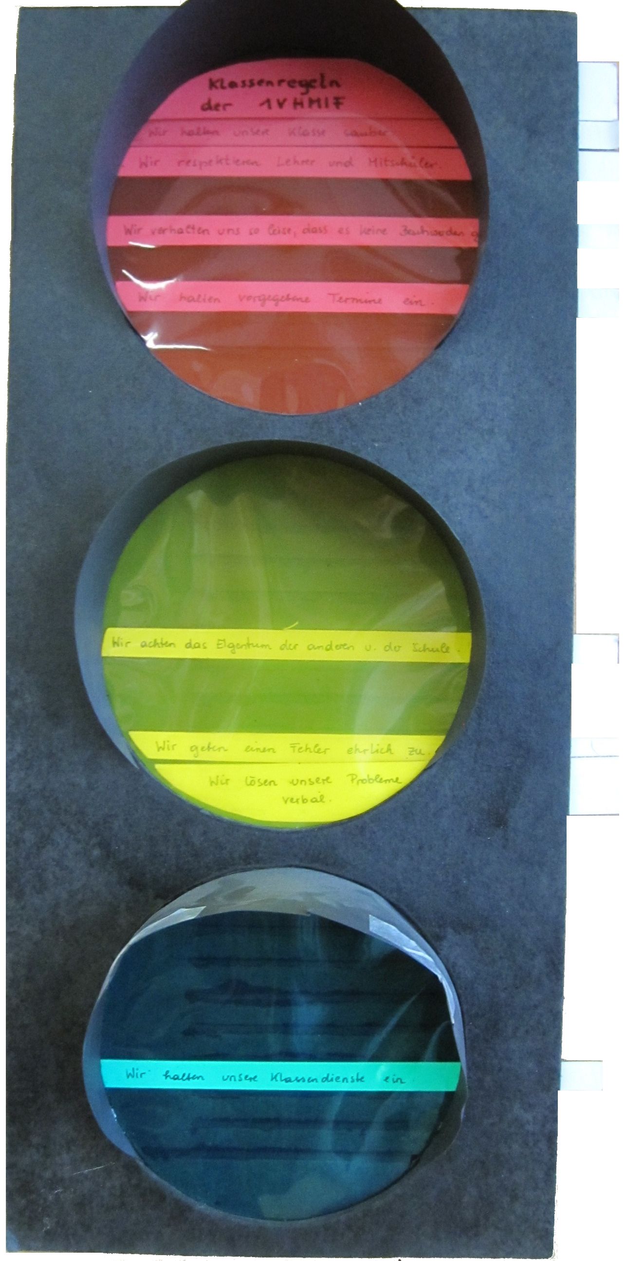 In der Handreichung „Vereinbarungskultur“ finden Sie für das Vereinbaren von Klassenregeln und die Pflege von Klassenregeln im Schulalltag mehrere Übungen und Anleitungen (s. S. 70-75). Eine Lehrerin aus der HTL-Blume-Voitsberg hat mit Schüler/innen der 1. Klasse Klassenregeln vereinbart und die Schüler/innen haben für die Einhaltung der Klassenregeln verschiedene Modelle nach dem Beispiel der Champions League (s.S. 74) überlegt. Die Schüler/innen wählten aus den vielen Ideen, die der Ampel für ihre Klassenregeln aus. Anbei finden Sie Fotos, wie die Einhaltung der vereinbarten Regeln mit dem Ampelsystem von dem Schüler für die Klasse verwirklicht und gestaltet wurde.